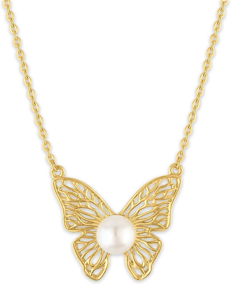 Feminine elegance defines this Macy's necklace, featuring a delicate butterfly motif and lustrous cultured freshwater pearl. Gold over sterling silver adds warmth, with a lobster clasp for secure fastening.
