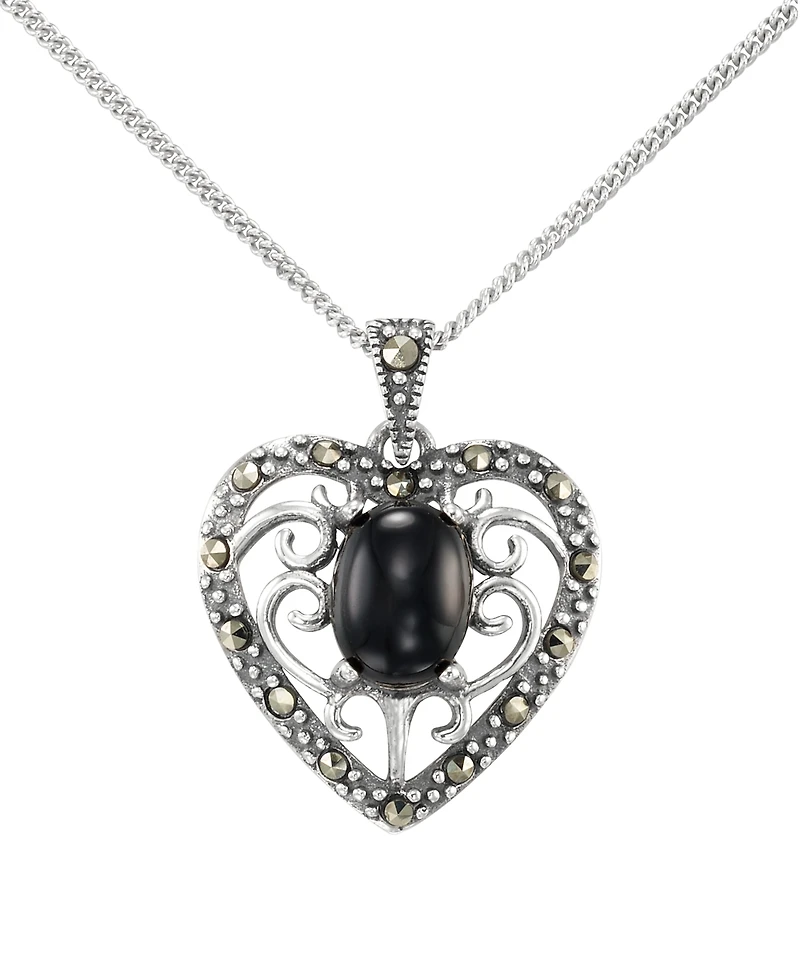 Macy's Marcasite (0.17 ct. t.w.) and Faceted Onyx (1-1/4 ct. t.w.) Heart Pendant Necklace in Sterling Silver