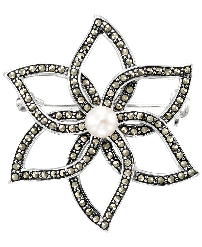 Macy's Marcasite (1 ct. t.w.) and Cultured Freshwater Pearl (4.5mm) Flower Brooch Pin in Sterling Silver