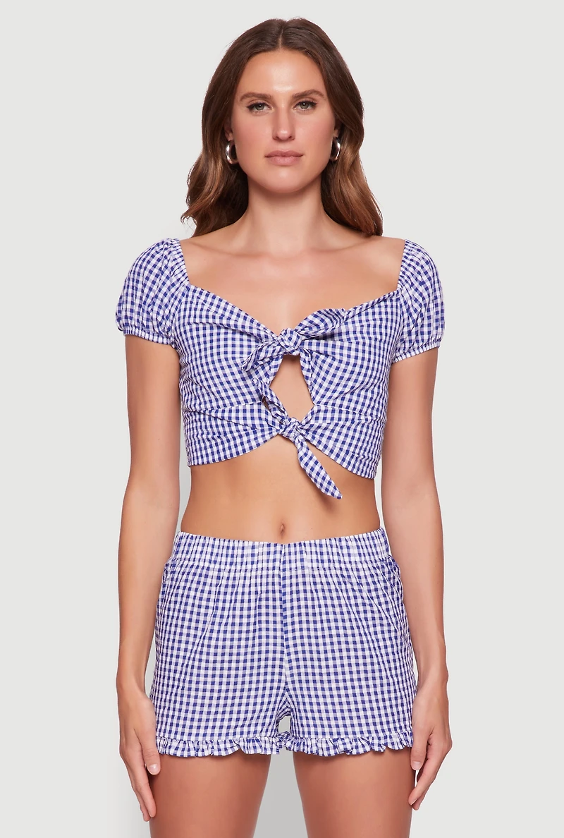 Madden Girl Gingham Peasant Top with Tie Front and Puff Sleeves