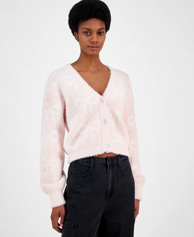 Madden Girl Juniors' Bow-Print Eyelash Button-Front Sweater
