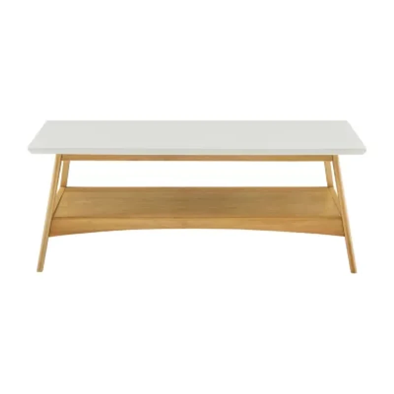 Add the bold Madison Park avalon coffee table to your living space. This all wooden mid century inspired desk will go nicely with your living room decor. It features a off white finish table top composed from manufactured wood, a solid wood frame, and a bottom shelf for extra storage space. The two tone gives this table a striking contrast.