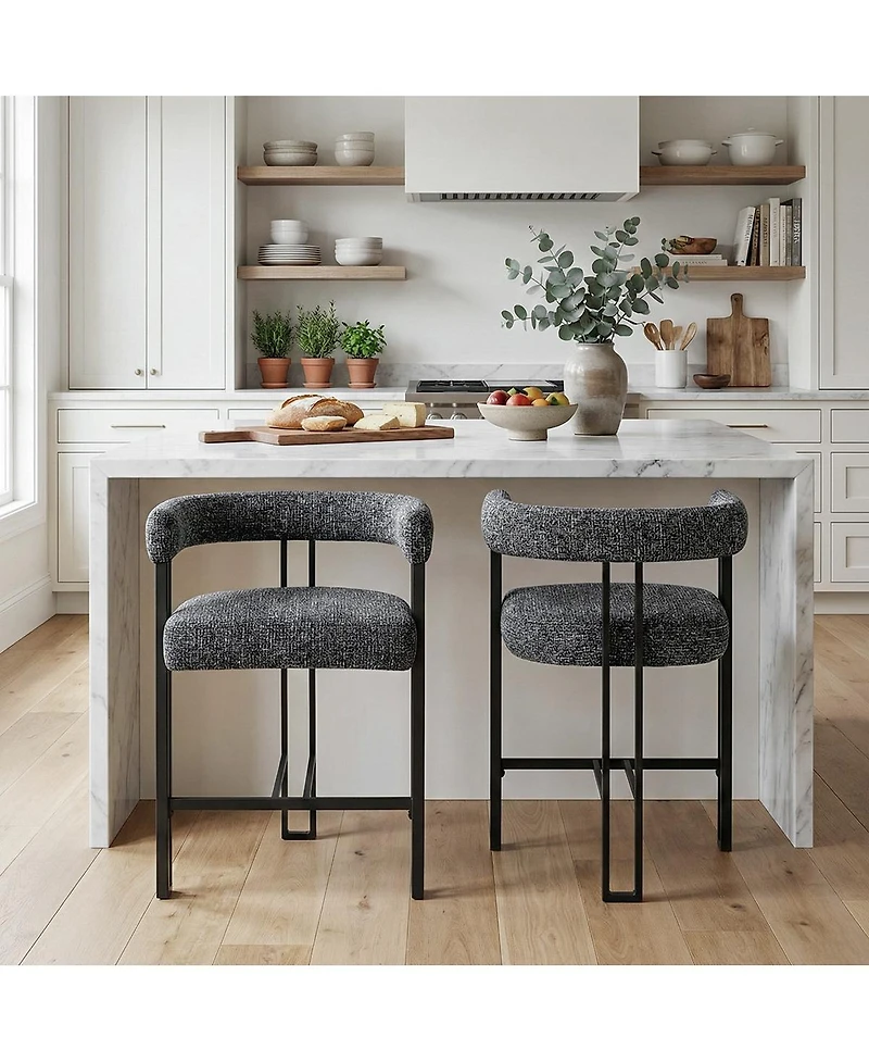 Elevate everyday island dining with this set of 2 counter height counter stools. Designed as modern upholstered counter stools with arms, they feature a sculptural barrel-style back, comfortable wraparound armrests, and a thick cushioned seat for relaxed counter seating. The premium fabric upholstery adds a soft, high-end look that fits contemporary, minimalist, and transitional kitchens. A sturdy metal frame material with slim metal legs and a built-in footrest provides stable support for kitchen island stools, breakfast bar stools, and counter-height dining. Ideal for 35""-39"" counters. Assembly required.