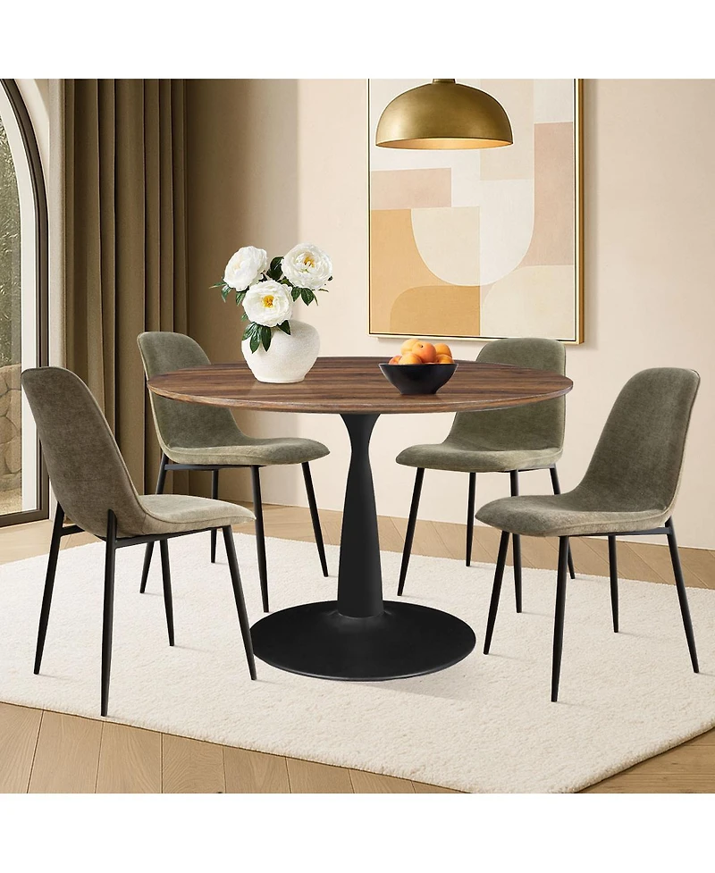 Elevate your dining space with this sleek 5-piece round dining set, perfect for modern apartments or cozy breakfast nooks. The 40" round Mdf tabletop features a realistic walnut wood veneer, paired with a sculptural black metal pedestal base for an industrial-modern look. Four side chairs come upholstered in soft-touch fabric with foam padding and black powder-coated metal legs for a clean, minimalist edge. Compact yet comfortable, this dining set easily seats four while fitting seamlessly into small kitchens or open-plan layouts. Built with durability and style in mind, it's ideal for everyday meals or casual gatherings.