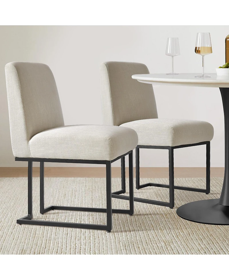 Elevate everyday dining with this set of 2 upholstered dining chairs featuring luxurious fabric upholstery, a plush cushioned seat, and a tall supportive back for comfortable sit-down meals and long conversations. The modern armless side chair profile slides easily under most dining tables and works as kitchen chairs, breakfast nook seating, or extra living room guest chairs. Built with a manufactured wood seat frame and a sturdy metal sled base, these modern dining room chairs deliver a clean, contemporary look that pairs well with round or rectangular tables.