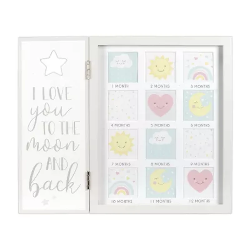 Add a sweet touch to your nursery decor with this adorable, hinged photo frame. This beautiful white wooden frame is the perfect way to display monthly photos of your little one. Constructed of high quality mdf wood, this frame holds (12) 2x2 inch vertical photos in 1.5x1.5-inch mat display openings. Left hand panel features a star cutout above the gray silk-screened sentiment, love you to the moon and back. This decorative 2 panel hinged frame is freestanding, making it perfect for tabletop or shelf display. Swing tab closures on removable back to easily change photos. Includes a durable glass front that will protect and showcase your precious memories for years to come. Perfect gift to give to new parents or to add to your own baby registry