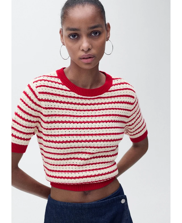 Mango Women's Striped Short Sleeve Crochet Sweater
