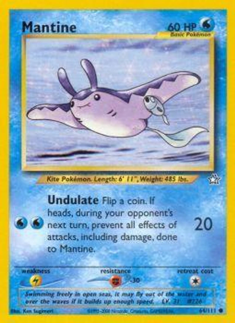 Set: Neo Genesis Card Number: 64/111 Rarity: Common Illustrator: Ken Sugimori Retreat Cost: 1 Weakness: HP: 60 Stage: Basic Card Type: Water Name: Mantine Finish: Regular Edition: Unlimited Manufacturer: Wizards of the Coast