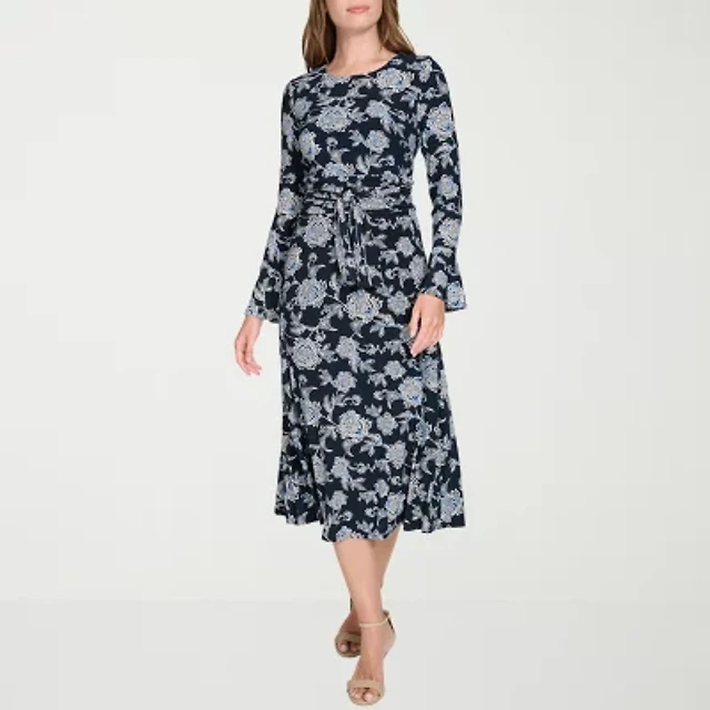 Marc New York Womens Long Sleeve Floral Midi Fit + Flare Dress