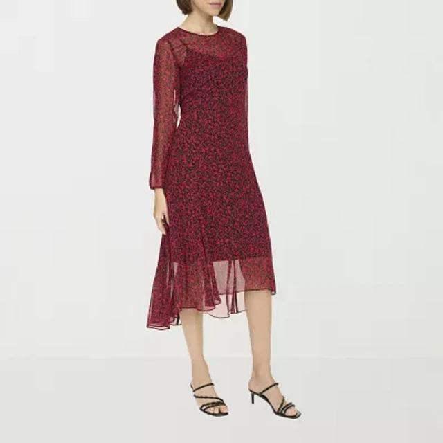 Marc New York Womens Long Sleeve Leaf Midi Fit + Flare Dress