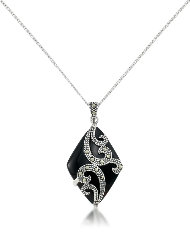 Marcasite and Faceted Onyx Square Pendant+18" Chain in Sterling Silver