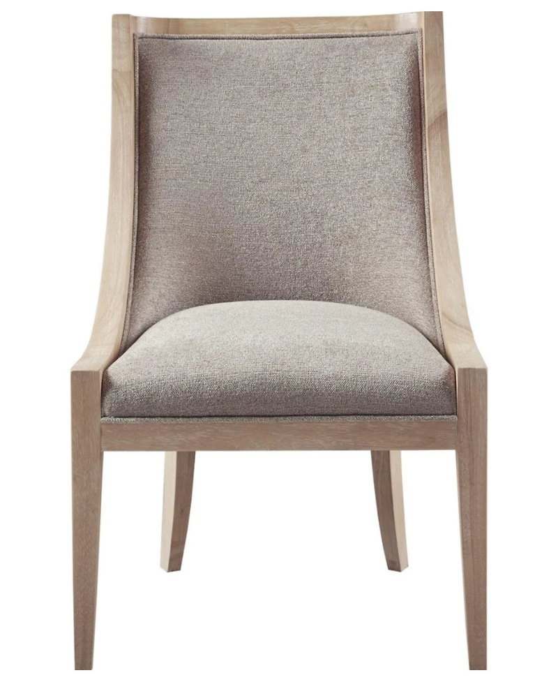 This transitional dining chair blends timeless elegance with modern comfort. Featuring an exposed wood frame, swoop arms, and brass nailhead accents, it's upholstered in durable polyester with a sinuous spring seat for support. Fully assembled for easy setup.