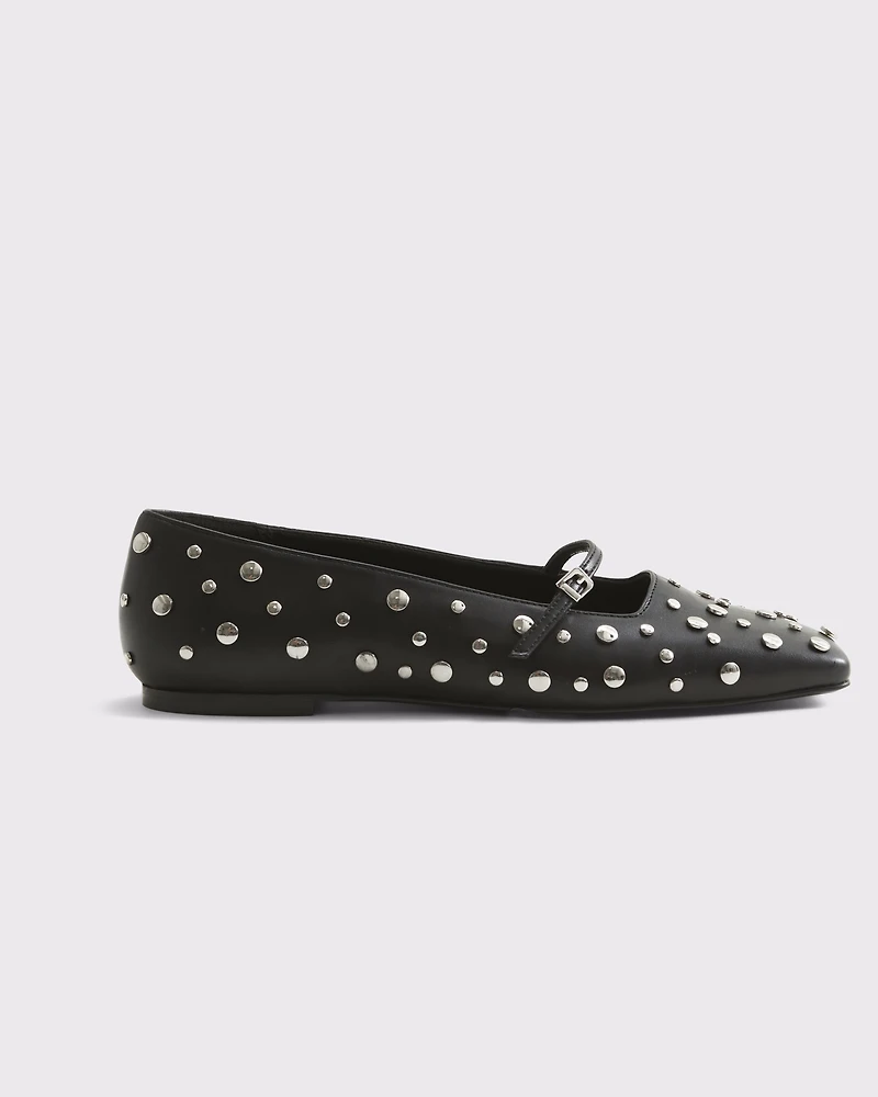 Our new Mary Jane flats featuring a square toe, all-over studded detail, strap detail with adjustable buckle across the foot and a wide plush footbed.