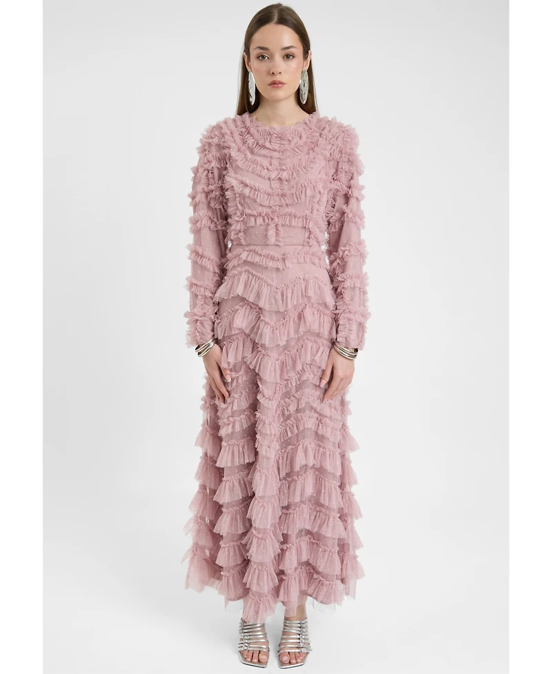 Maryisa Women's Modest Ruffle Dress Maxi With Self Print Mesh
