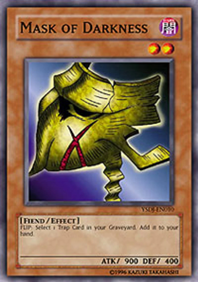 Card Rules: Rulings powered by The Netrep API. [Re: Disappear] When a card that selects a card in the Graveyard as a target , such as 'Monster Reborn' 'Mask of Darkness' 'Magician of Faith' 'Spear Cretin' or 'The Shallow Grave' is activated you may chain 'Disappear' to remove the targeted card from play and the 'Monster Reborn' etc. will resolve without effect. This is because these cards select their target at activation not resolution. [Re: Embodiment of Apophis] When 'Embodiment of Apophis' is sent to the Graveyard it is sent as a Trap Card and remains treated as a Trap Card. You cannot revive it with 'Monster Reborn' or retrieve it with 'Return of the Doomed'. It will not trigger 'Last Will'. You cannot activate 'Michizure'. It will not be Special Summoned by 'Red-Moon Baby'. No damage is inflicted by 'KA-2 Des Scissors' or 'Inferno' or 'Fatal Abacus'. 'Emes the Infinity' does not increase its ATK. No Life Points are increased by 'Absorbing Kid from the Sky'. You would not gain Life Points for 'Altar for Tribute'. (You can however now add it back to your hand with 'Mask of Darkness'.) Passcode: 28933734 Set: Starter Deck: Jaden Yuki ATK/DEF: 900/400 Card Number: YSDJ-EN010 Monster Type: Fiend Rarity: Common Attribute: Dark Card Text: FLIP: Select 1 Trap Card from your Graveyard. Add it to your hand. Level: 2 Card Type: Effect Monster Name: Mask of Darkness Edition: 1st