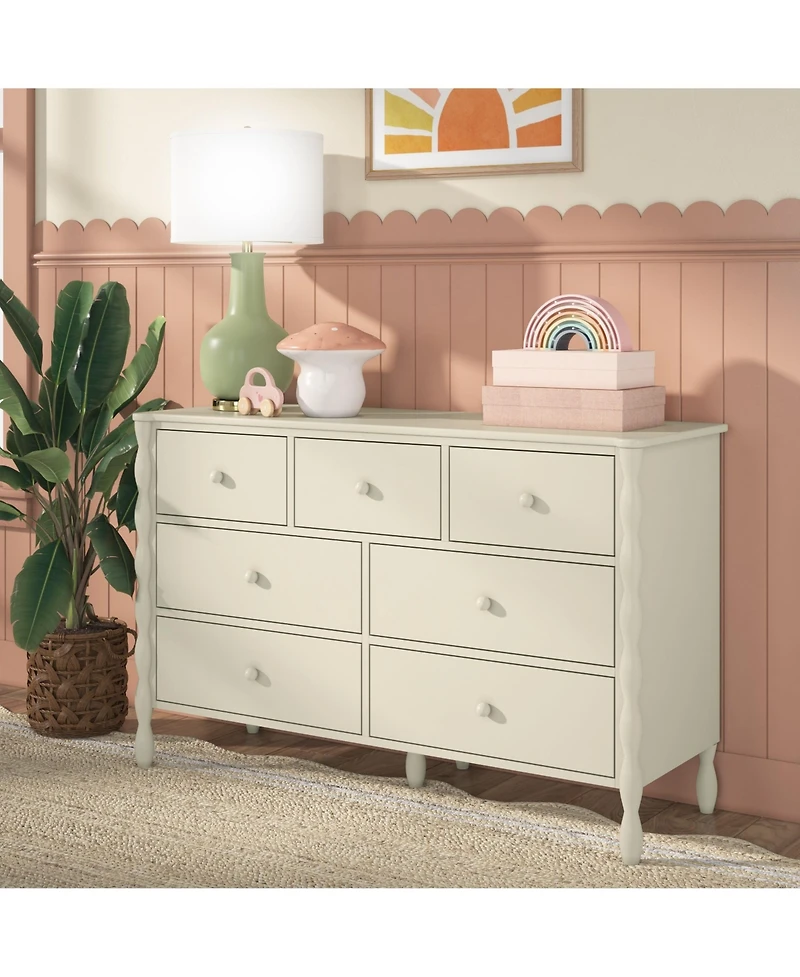 Plenty of space for clothes, treasures, and everything in between! The Max and Lily Jenny 7-Drawer Dresser combines playful charm with lasting quality. Inspired by the timeless Jenny Lind style, this dresser features signature turned spindle legs and round wooden knobs, adding a classic, vintage-inspired touch to any kids room. Built to last, the Jenny Dresser is crafted from knot-free, solid pine wood with engineered wood drawer bottoms for extra strength and durability. A clean, low-voc finish supports a healthy indoor environment, while smooth-glide drawers make organization easy for little hands. With seven total drawers-four large and three smaller top drawers-there s a place for everything. The smaller drawers are perfect for accessories and small essentials, while the larger ones keep clothes and bulkier items neatly stored.