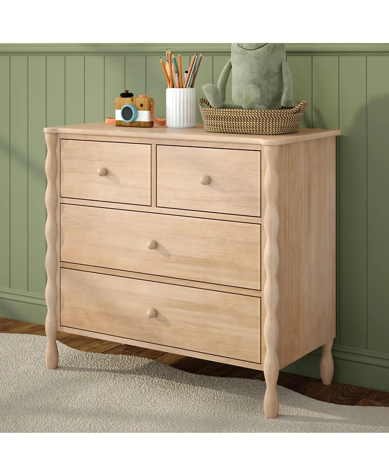 Plenty of space for clothes, treasures, and everything in between! The Max and Lily Jenny 4-Drawer Dresser combines playful charm with lasting quality. Inspired by the timeless Jenny Lind style, this dresser features signature turned spindle legs and round wooden knobs, adding a classic, vintage-inspired touch to any kids room. Crafted from knot-free, solid pine wood with engineered wood drawer bottoms, the Jenny Dresser is built for strength and durability that lasts through every stage of childhood. A clean, low-voc finish supports a healthy indoor environment, while smooth-glide drawers make it easy for little hands to open and close. With four drawers-two large and two smaller top drawers-there s a perfect spot for everything. The smaller drawers are ideal for accessories and bedtime essentials, while the larger drawers keep clothes and bulkier items neatly stored and easy to find.