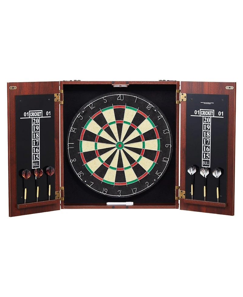 Elevate your game room with this Dartboard and Cabinet Set, featuring an official-size 18"" dartboard crafted from self-healing sisal fiber for long-lasting performance. The stylish retro cabinet with a rich woodgrain finish adds a classic touch while keeping your dartboard protected from dust and damage. Perfect for both casual fun and competitive play, this complete set includes 6 steel tip darts, markers, a cleaning rag, and all necessary mounting hardware. With a classic black wipe-clean scoreboard and quick, straightforward assembly, you ll be ready to play in minutes.
