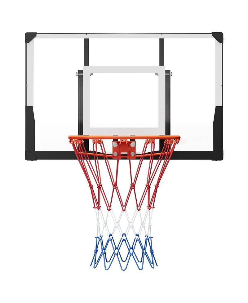 Transform any space into a basketball court with this durable indoor/outdoor wall-mount hoop system, perfect for backyards, garages, and home gyms. The shatterproof 44-inch Pc backboard delivers consistent rebounds and clear visibility, while the reinforced steel structure and multi-point mounting ensure rock-solid stability during intense play. Designed to withstand sun, rain, and temperature changes, the all-weather woven net resists tearing and fading for long-lasting performance. High-strength expansion bolts make installation on concrete walls quick, secure, and hassle-free, so you can set up and start playing in no time. Ideal for family fun, casual training, and friendly competition, this hoop supports adjustable height to match different players and spaces, providing reliable, professional-style play for kids and adults alike.