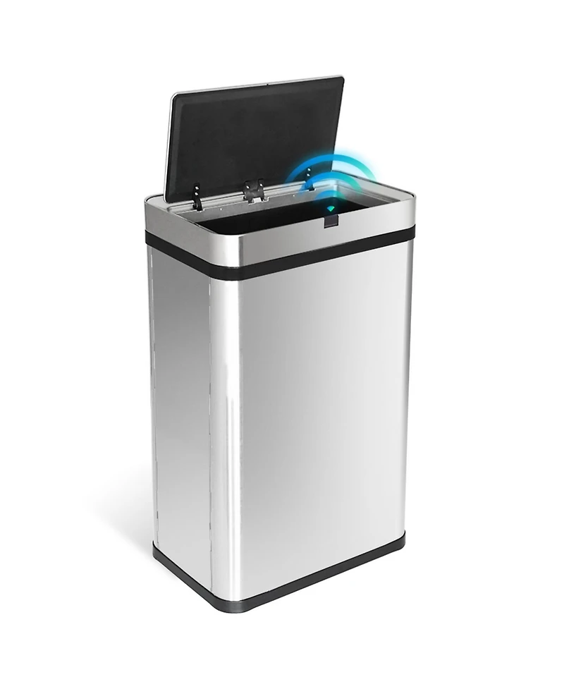 16-gallon stainless steel rectangular kitchen motion sensor trash can has a sensor-activated lid that opens automatically with a wave of a hand for touch-free operation and easy trash disposal. Stainless steel with fingerprint-resistant coating. A stay-open control feature and non-skid base provide for longer chores and convenient trash removal. The removable trash bag holder holds a trash bag in place, and the lid hides the trash bag's overhang for a neat appearance. Perfect for the kitchen, home office, and business office breakroom.