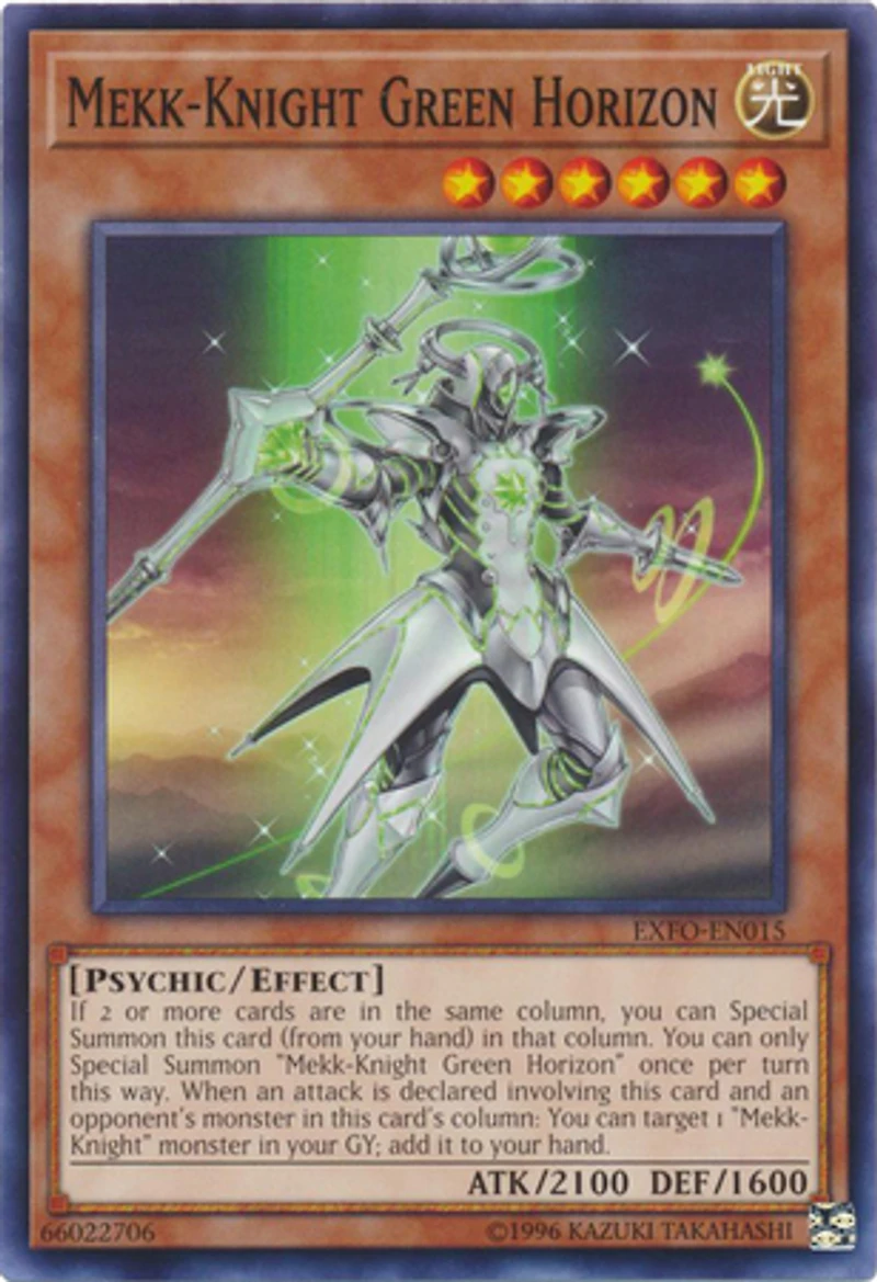 Set: Extreme Force ATK/DEF: 2100 / 1600 Card Number: EXFO-EN015 Rarity: Common Card Text: If 2 or more cards are in the same column , you can Special Summon this card (from your hand) in that column. You can only Special Summon "Mekk-Knight Green Horizon" once per turn this way. When an attack is declared involved this card and an opponent's monster in this card's column: You can target 1 "Mekk-Knight" monster in your GY add it to your hand. Name: Mekk-Knight Green Horizon Edition: Unlimited