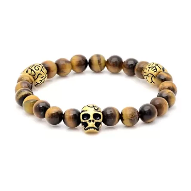 Mens Multi Color Tiger's Eye 18K Gold Stainless Steel Skull Beaded Bracelet