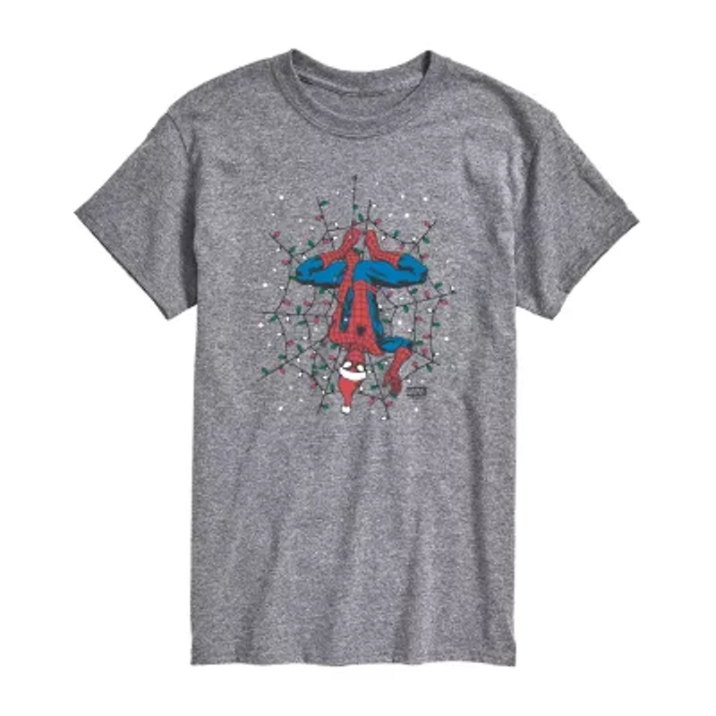 Spider-Man Deck the Walls Men's Short Sleeve Graphic T-shirt - Supercharge your holidays with Marvel! Christmas-themed graphic tees showcase superheroes in festive action, combining heroics and holiday cheer for fans of all ages.