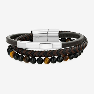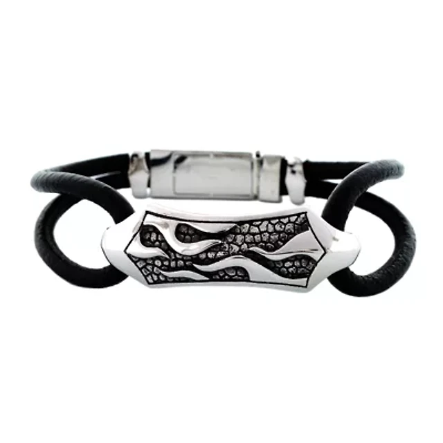 Black Leather Mens Stainless Steel Wrap Bracelet
