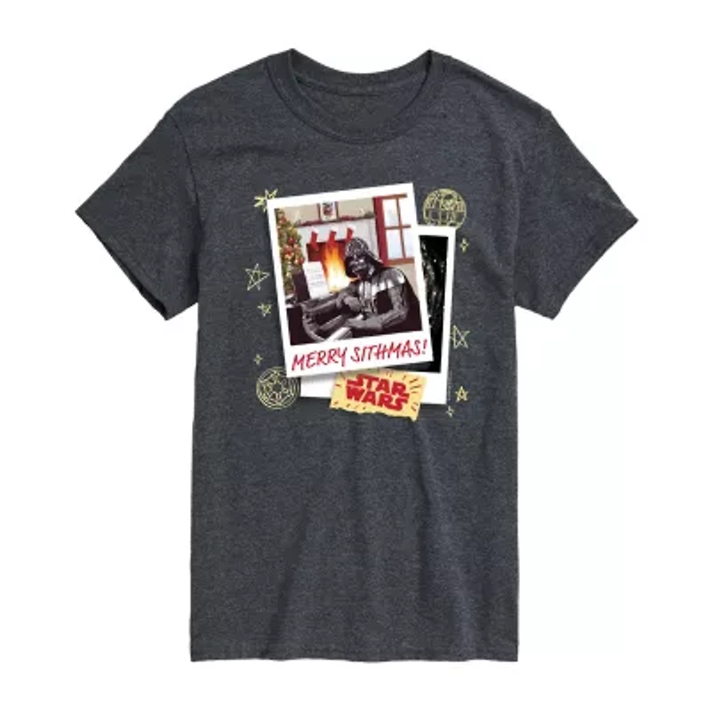 Star Wars Merry Sithmas Photo Men's Short Sleeve Graphic T-shirt - Bring the Force to the holidays with Star Wars Christmas-themed graphic apparel. Featuring festive takes on iconic characters like Darth Vader, Yoda, and stormtroopers, these tees blend galactic style with holiday cheer.