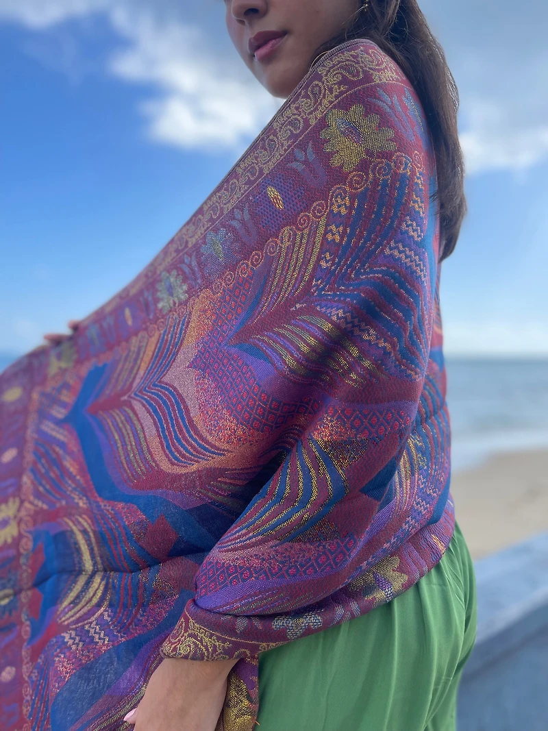 New design... we love this shiny pashmina... It has stunning colors and is reversible.