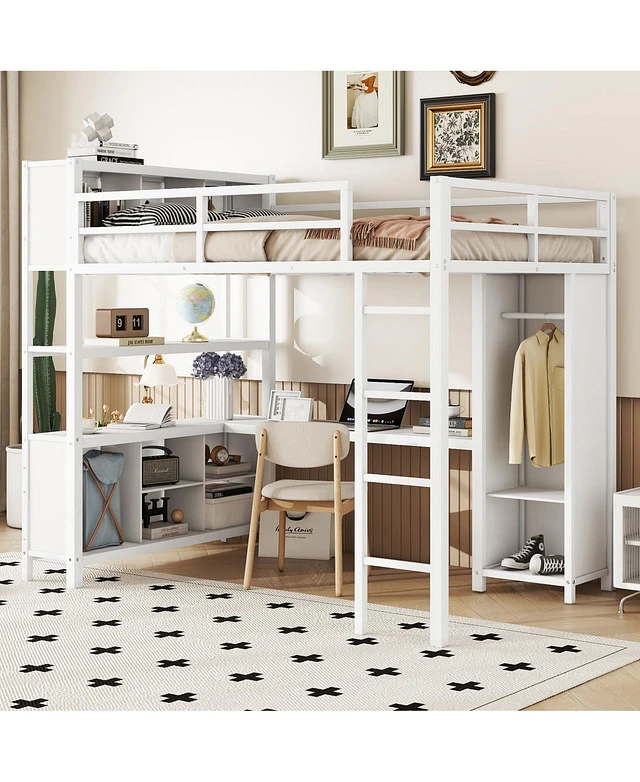 Metal Loft Bed with Wardrobe And L-shaped Desk, Full Size Loft Bed with Storage Cubes and Shelves, Heavy Duty Loft Bed for Kids Teens Adults, White(Pr