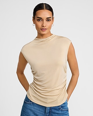 Metallic Mock Neck Cap Sleeve Ruched Tank