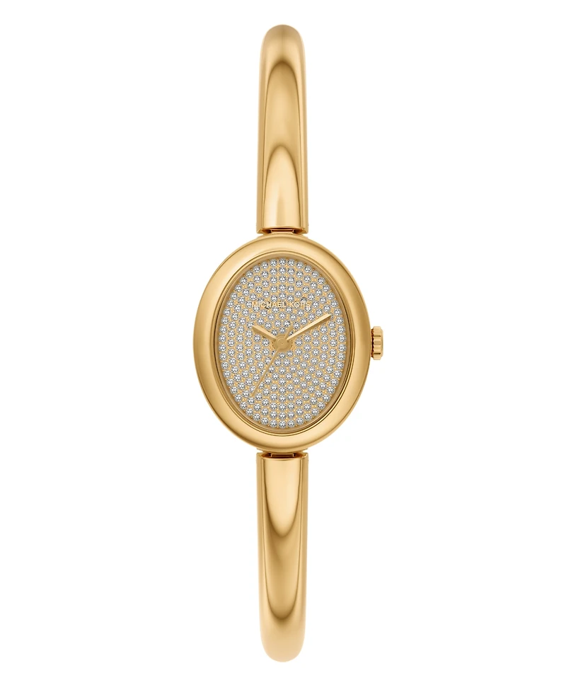Our sleek oval Maude returns in an elevated bangle silhouette, complete with a sparkling pave dial for added shine. Designed with jewelry stacking in mind, this polished gold-tone stainless steel update delivers a modern expression of timeless elegance. Style MK7593