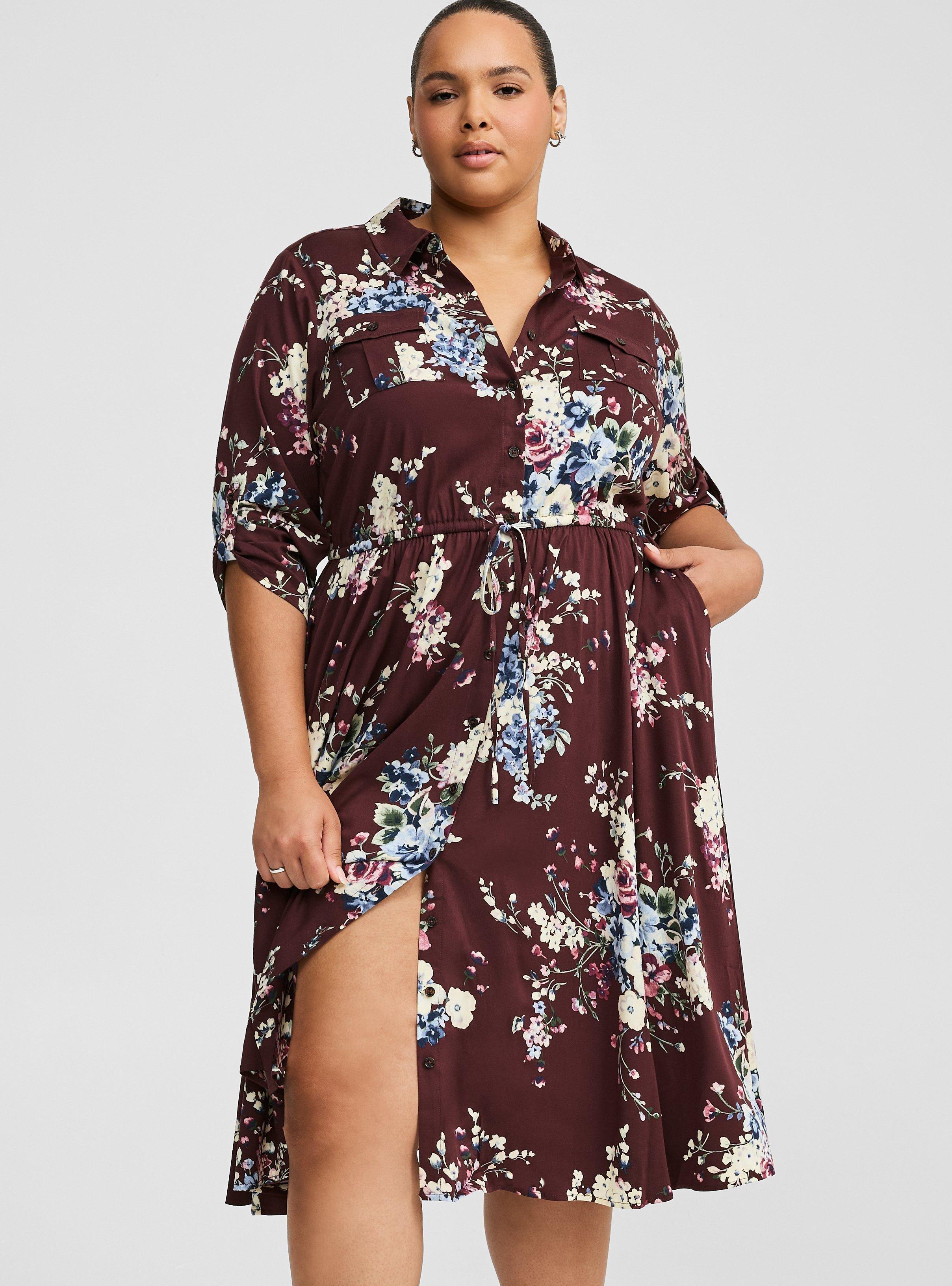 FIT Measures 48"" from shoulder (size 2). MATERIALS + CARE Challis woven fabric: Your favorite easy-but-polished fabric with the perfect touch of stretch. 97% rayon, 3% spandex. Machine wash cold. Line dry. Imported. DETAILS Collared neckline. 3/4 sleeves. Button front. Optional waist tie Functional pockets.