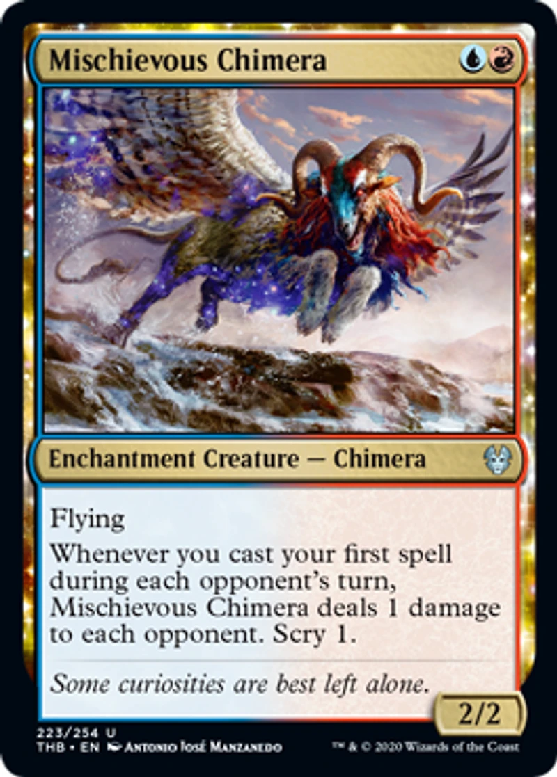 Color: Multi-Color Card Text: FlyingWhenever you cast your first spell during each opponent's turn , Mischievous Chimera deals 1 damage to each opponent. Scry 1. Rarity: U Cost: UR Pow/Tgh: 2/2 Card Type: Enchantment Creature - Chimera Artist: Antonio Jose Manzanedo Name: Mischievous Chimera Finish: Regular Card Number: 223/254 Set Name: Theros Beyond Death
