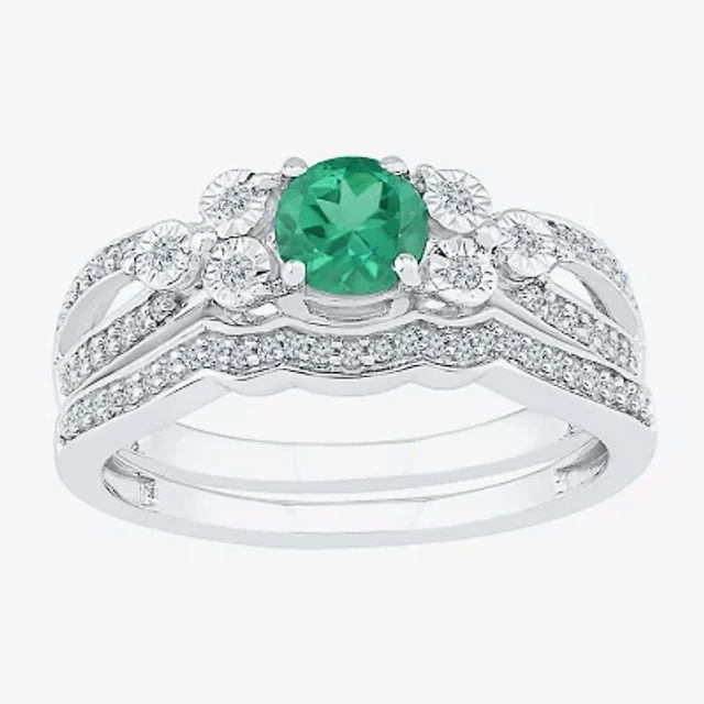 Modern Bride Gemstone Lab Created Emerald & 1/5 CT. T.W. Diamond Sterling Silver Bridal Set