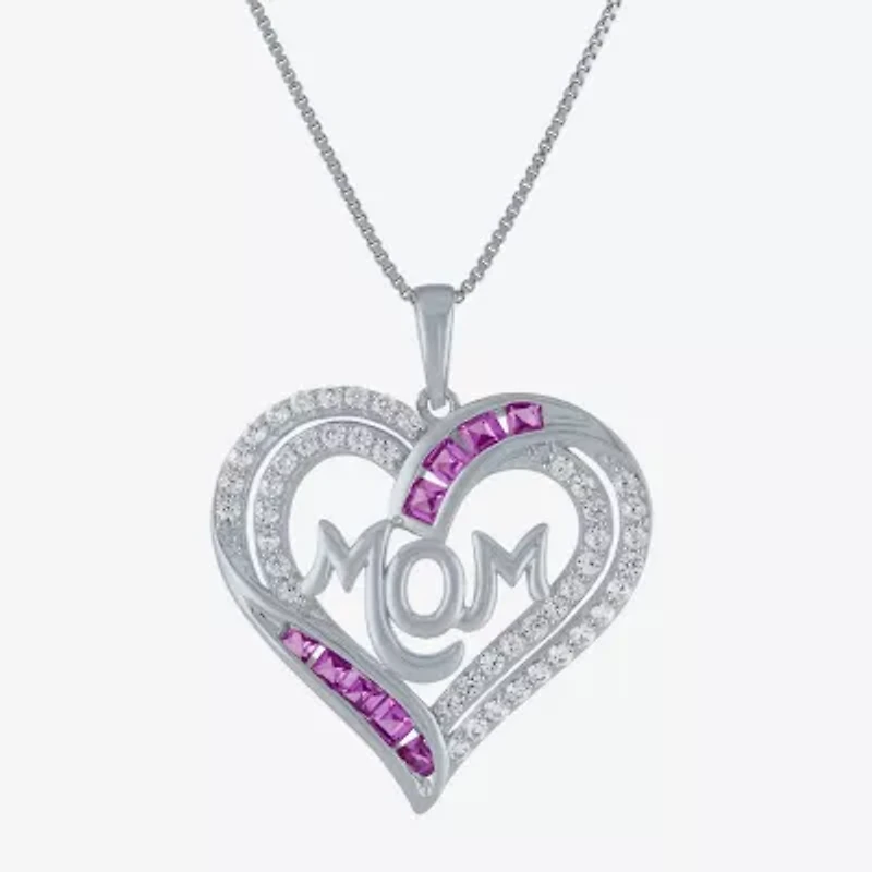Mom" Womens Lab Created Pink Sapphire Sterling Silver Heart 18 Inch Pendant Necklace