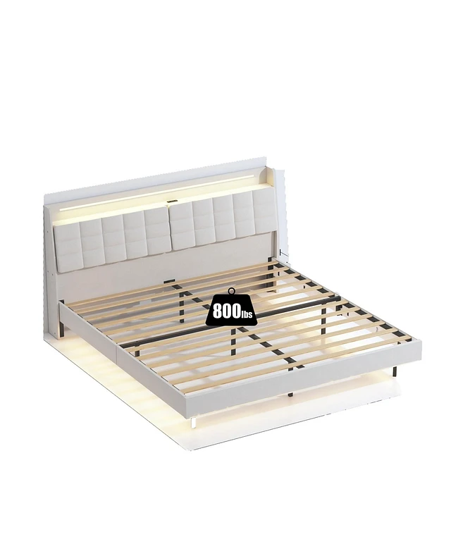 Mondawe Beige Floating Bed Frame with Led Light and Charging Station Upholstered Platform