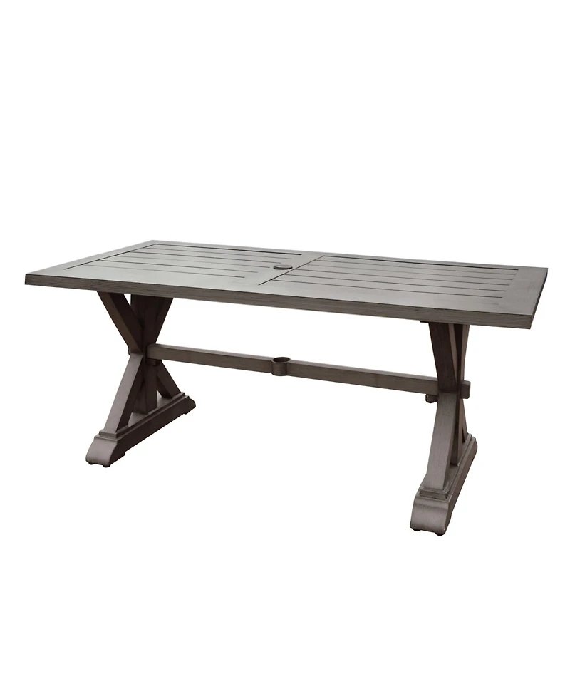 Bring family and friends together with this sleek outdoor dining table. Crafted from rust-resistant aluminum with modern X-shaped legs and a slatted tabletop, it offers durability, style, and space for an umbrella, perfect for any patio or backyard.