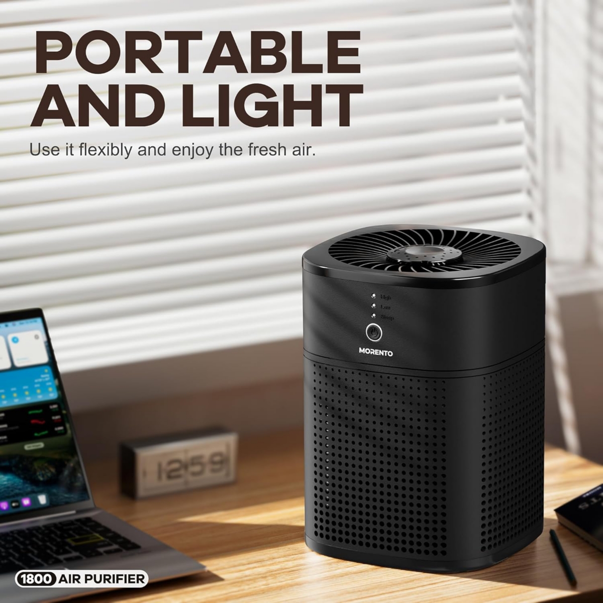Morento small air purifiers for smokers uses an advanced 3-Stage filtration system.Create a comfortable environment for work, study, or daily life. This air purifiers for dust is user friendly, which can switch between three speeds and timer mode and our products come with a one-year warranty.