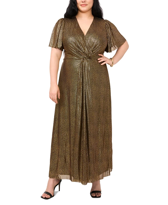 Msk Plus Shimmer-Dot V-Neck Flutter-Sleeve Gown