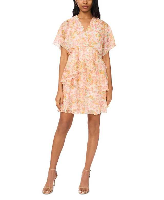Msk Women's Printed V-Neck Dolman-Sleeve Tiered Dress
