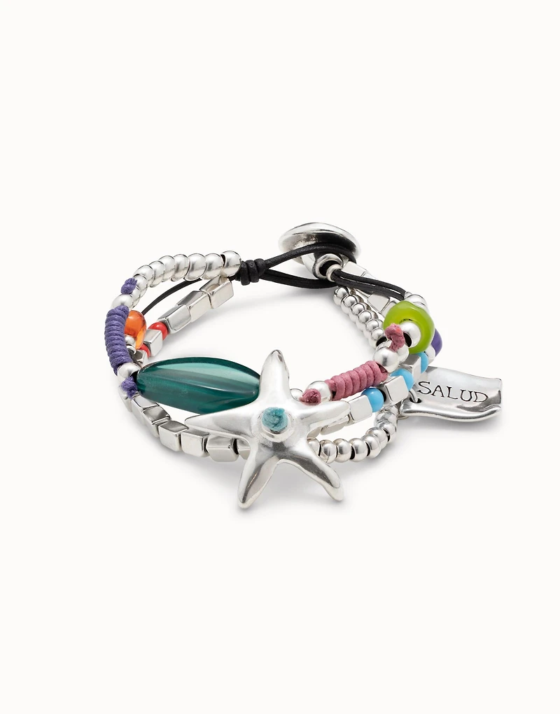 Sterling silver-plated bracelet with multi-strand design, colored resin beads, beads and the message “health”. Made in Spain under a handcrafted process.