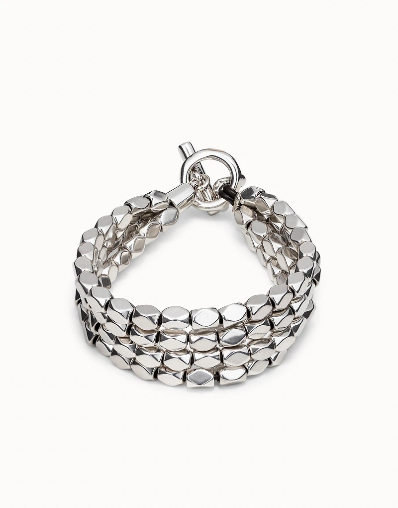 Wear an authentic jewel from the Glow collection for the most special moments and with casual looks, you can wear this exclusive and versatile bracelet. Silver-plated metal jewel with four strips of faceted diamond-shaped pins and T-bar fastener. Handcrafted 100% in Spain.