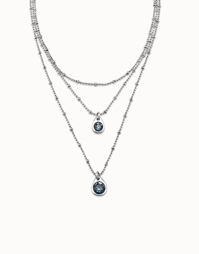Three-strand sterling silver-plated necklace with two Indian Sapphire blue SWAROVSKI® crystals in the shape of a water drop. Jewel 100% handcrafted by UNOde50 in Spain.
