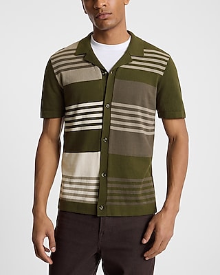 A short sleeve sweater polo that features a camp collar, a full button front, and a multi striped pattern.