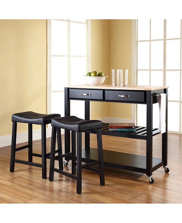Crosley Oxford Butcher Block Top Kitchen Island With 24" Upholstered Saddle Stools