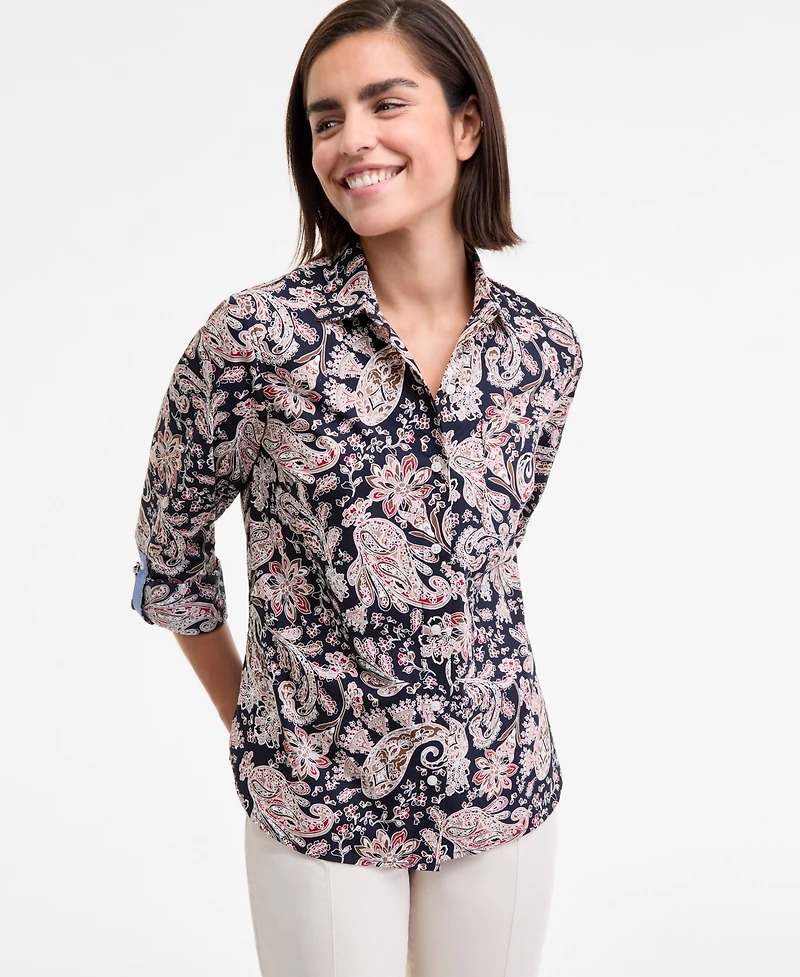 Nautica Jeans Women's Cotton Paisley-Print Roll-Tab Shirt