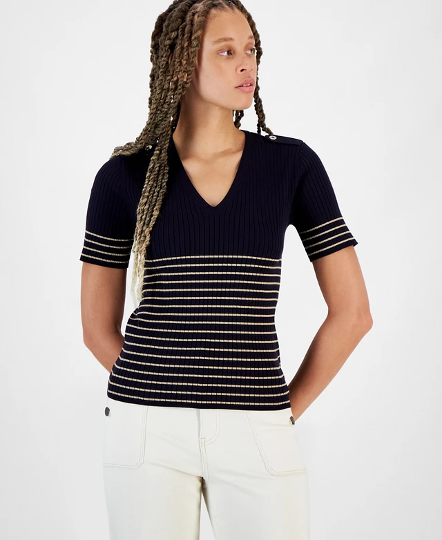 Nautica Jeans Women's Metallic-Stripe Short-Sleeve Sweater