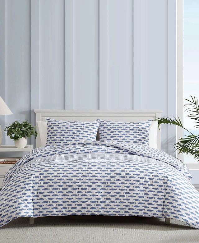 Nautica Woodblock Fish Percale 3-Pc. Duvet Cover Set